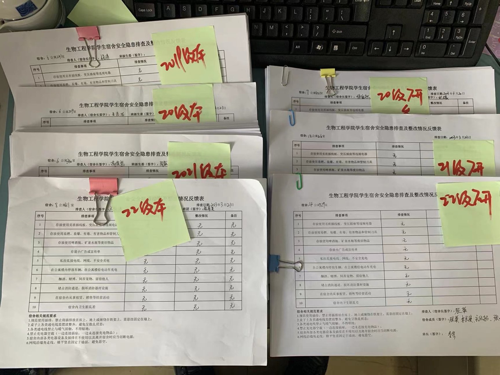 学院自3月20日下发《全讯新2网官网关于开展学生宿舍安全隐患排查整治活动的通知》后,全体学生宿舍网格员(宿舍长)会同宿舍成员先行开展认真自查,签写《生物工程学学生宿舍安全隐患排查及整改情况反馈表》。