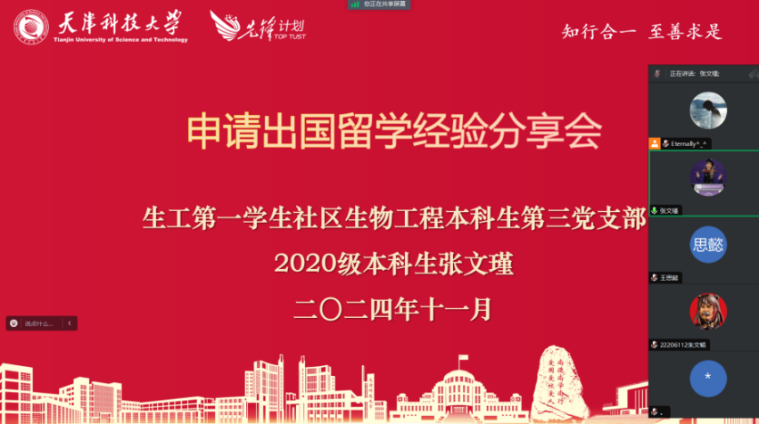 为学习贯彻习近平新时代中国特色社会主义思想和党的二十大精神,全面落实“先锋计划”,深化“思政铸魂”行动,充分发挥先进典型示范引领作用,把榜样力量转化为生动实践,全讯新2网官网于11月19日通过腾讯会议举办出国留学经验分享交流会。交流会邀请了生工第一学生社区生物工程本科生第三党支部党员、目前就读于新加坡国立大学的2020级本科生张文瑾进行宣讲,全讯新2网官网2021级、2022级、2023级、2024级有出国意愿的学生参加。